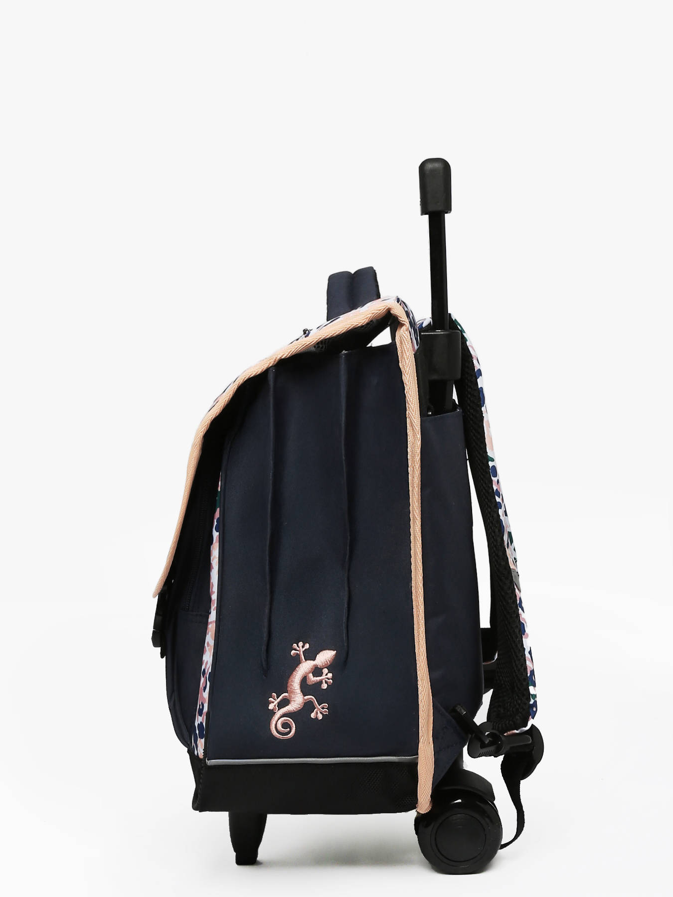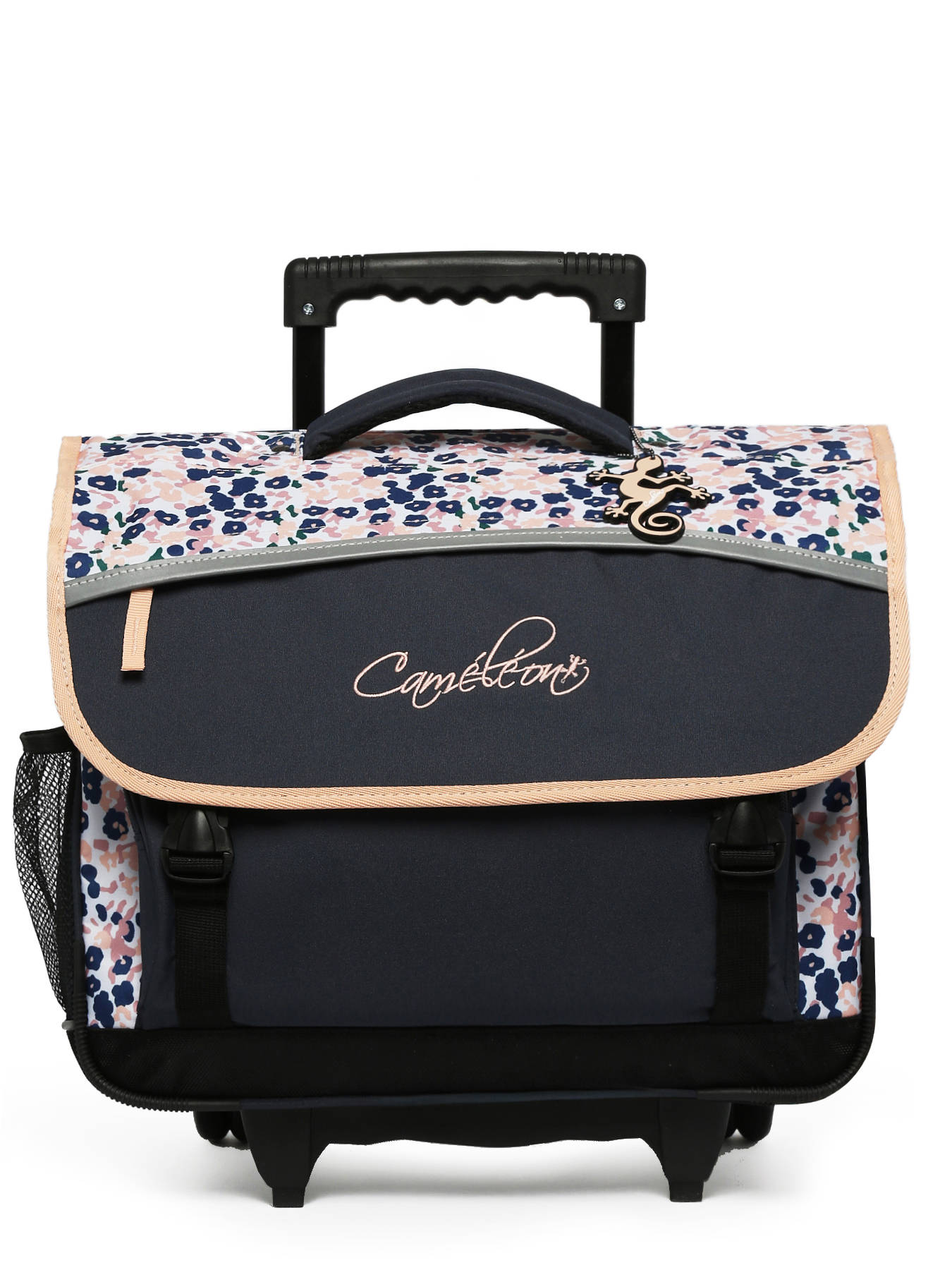 41 cm - 22 litres - 2.6 kg ~ Cartable enfant à roulettes 41 cm de la ligne Actual signé Caméléon. Ce cartable enfant convient parfaitement pour les classes de CM1 et de CM2. L'intérieur se divise en trois compartiments pouvant contenir toutes les affaires scolaires : cahiers formats 21x29,7 cm, 24x32 cm, classeurs A4 et classeurs A4 comptabilité. Il comprend une grande poche zippée intérieure et deux poches extérieures à fermeture éclair, très pratiques pour ranger les petits effets comme l’agenda ou le goûter. Un emplacement est prévu sur le côté pour y glisser une gourde. Ce cartable enfant à roulettes est fabriqué en polyester recyclé imperméable, résistant à l’eau pour un usage quotidien par tous les temps. Pour le faire rouler, il suffit de ranger les bretelles dans la poche au dos. Lorsqu’il est porté sur le dos, une protection rembourrée empêche le contact direct avec l’armature des roues, assurant un confort optimal. Le dos et les bretelles sont rembourrés, et le fond est renforcé pour une meilleure durabilité. Enfin, pour garantir une sécurité renforcée, des bandes réfléchissantes sont disposées tout autour du cartable. Petit plus : une étiquette pour le nom est présente au dos et une règle est offerte !